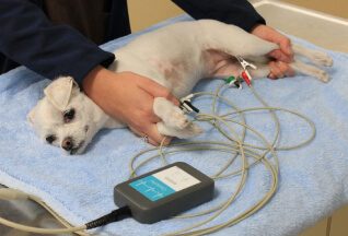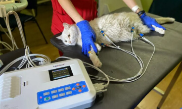 ЭКГ (электрокардиография) представляет собой метод инструментального исследования, применяемый для оценки работы сердца у животных, основанный на измерении и записи электрических потенциалов, возникающих в процессе его функционирования. После получения графической записи, ее анализируют и делают заключение. Кардиограмма отображает периодически повторяющийся набор зубцов. Анализ электрокардиограммы позволяет обнаружить нарушения в проведении импульсов и ритме сердечной мышцы, а также определить размеры сердечных камер и положение сердца в грудной клетке.