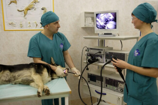 Ветеринар-эндоскопист вставляет в пищевод животного гибкий конец эндоскопа, с постепенным, плавным продвижением по желудочно-кишечному тракту. Аппарат позволяет: